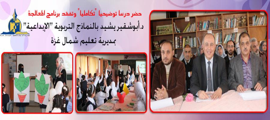 أشاد وكيل وزارة التربية والتعليم العالي د.محمد أبوشقير بما وصفها بـ"النماذج التربوية الإبداعية" التي تشهدها مديرية التربية والتعليم في شمال غزة، داعيا كافة العاملين في الحقل التربوي إلى الخروج عن النمطية التربوية بما يواكب التطور الذي تشهده العملية التعليمية ويحقق الصالح العام.