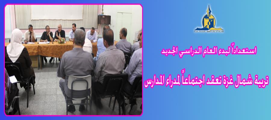 عقدت مديرية التربية والتعليم في شمال غزة اليوم اجتماعاً لمدراء ومديرات المدارس وذلك في إطار الترتيبات التي تجريها المديرية استعداداً لانطلاق العام الدراسي الجديد 2013-2014 المرتقب في الخامس والعشرين من الشهر الجاري.