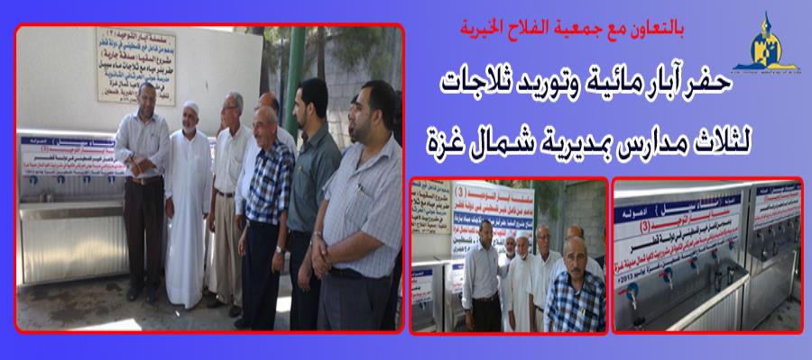 ونُفذت المشاريع الثلاثة من خلال جمعية الفلاح الخيرية وبتبرع سخي من فاعلي خير فلسطينيين مقيمين في دولة قطر الشقيقة، حيث تم التنفيذ بمدارس حليمة السعدية الأساسية للبنات، وفاطمة بنت أسد الأساسية للبنات، وعوني الحرتاني الثانوية للبنات، بواقع بئر مياه وثلاجتين لكل مدرسة.