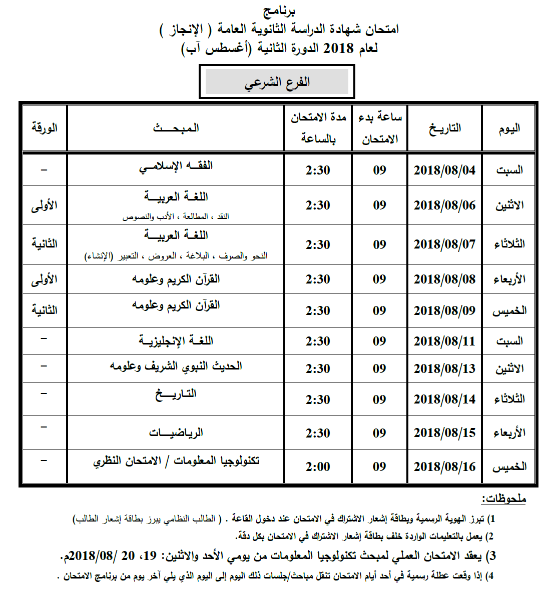 الجدول الشامل لامتحانات الإكمال و التحسين إنجاز الدورة الثانية